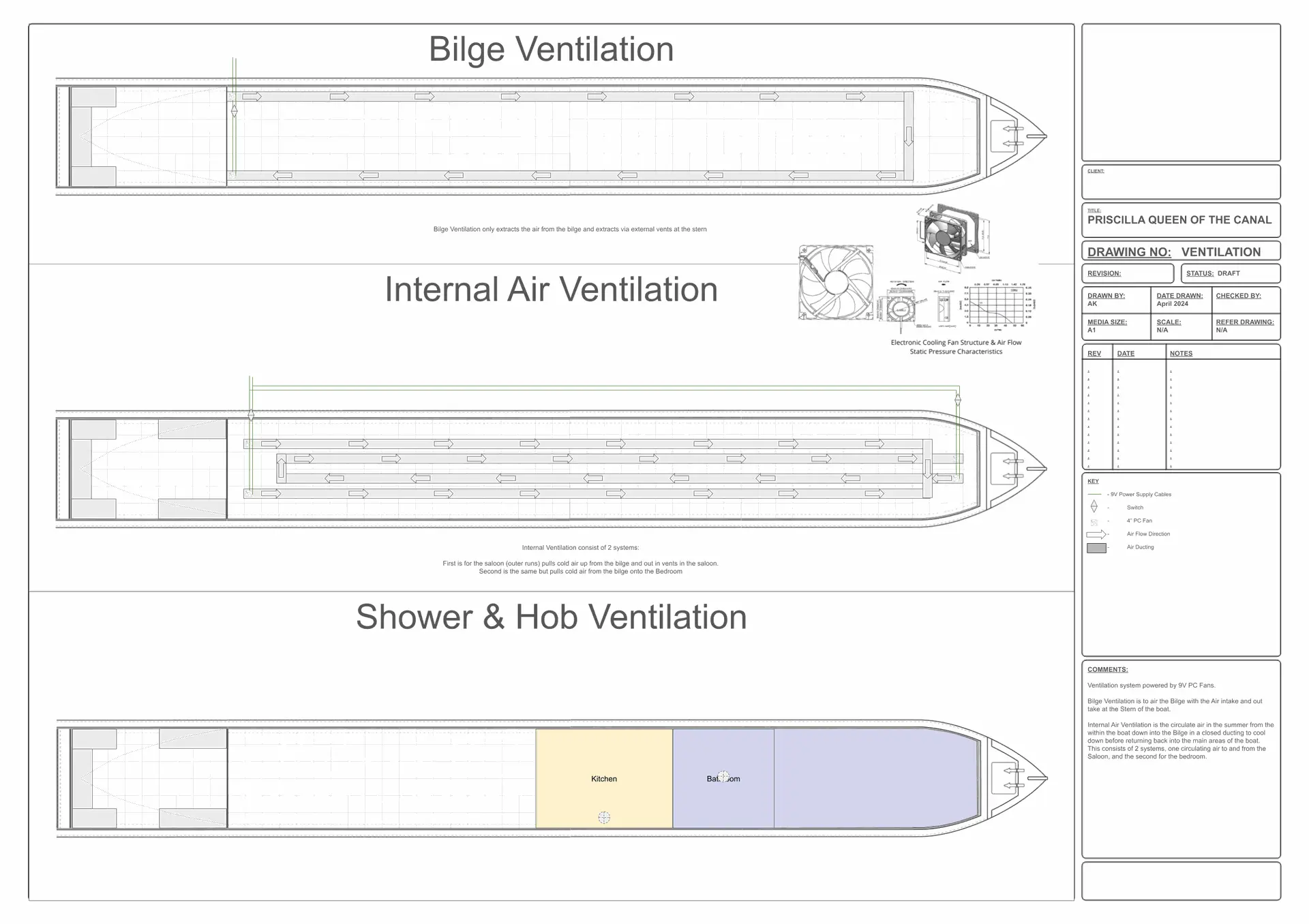Maintaining a comfortable environment on a narrowboat, particularly during the warm summer months, requires a well-thought-out ventilation system. On our 58-foot narrowboat, we’re designing an innovative bilge ventilation system that not only keeps the bilge dry and free of moisture but also helps cool the interior by circulating air through strategically placed ducts and mini fans. Additionally, our kitchen and bathroom extraction systems will ensure that air quality is maintained, even in the most humid or odorous conditions.